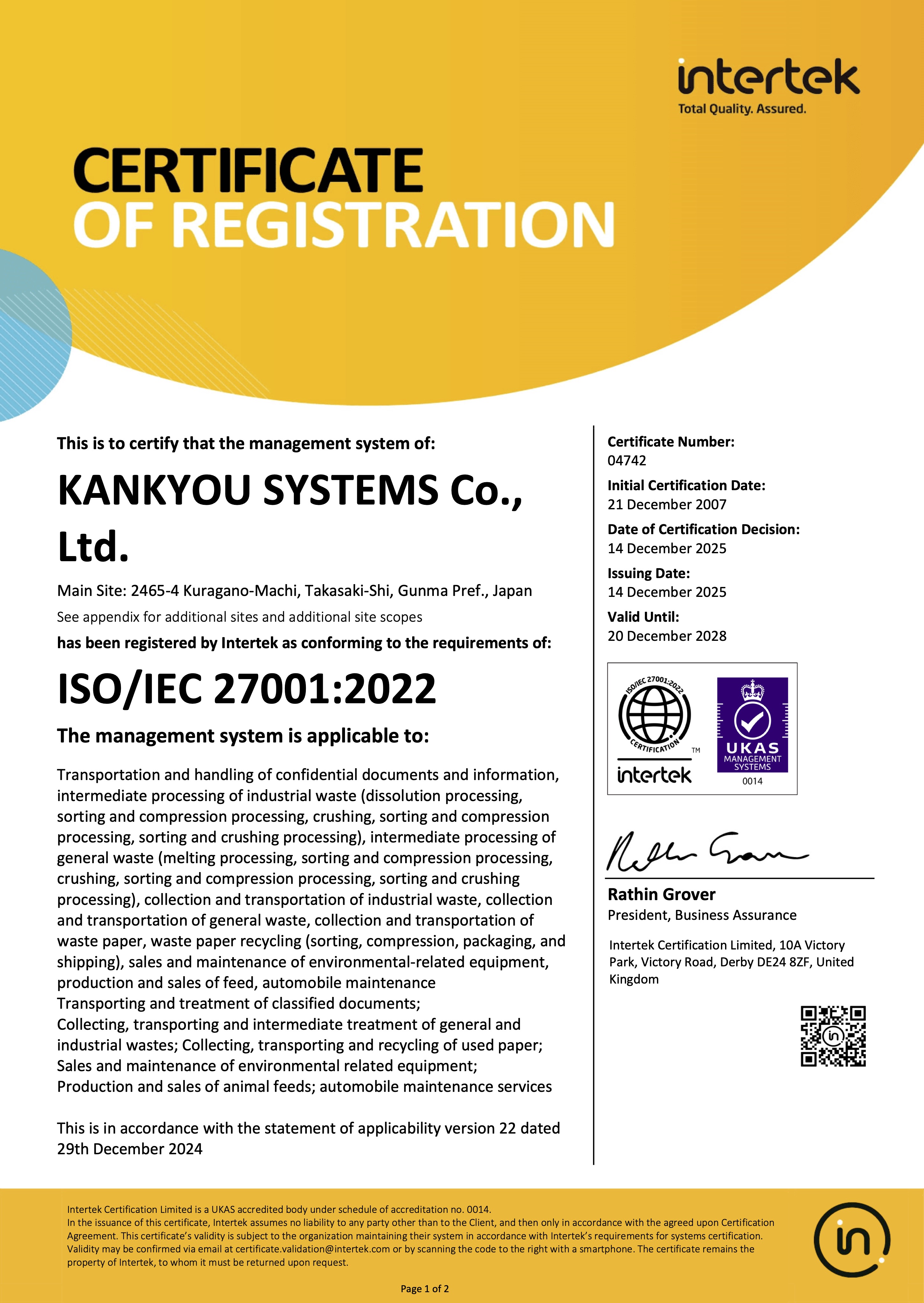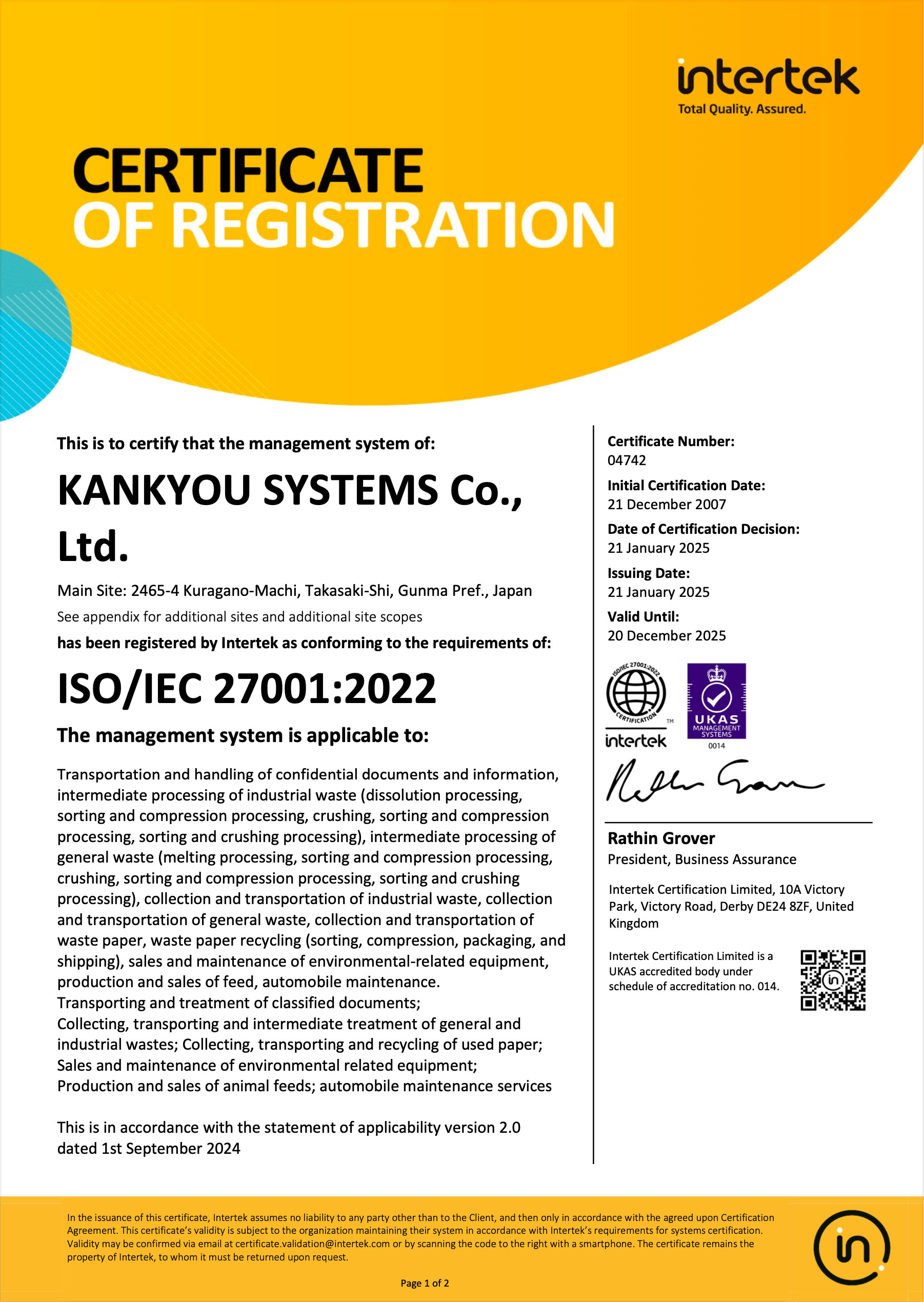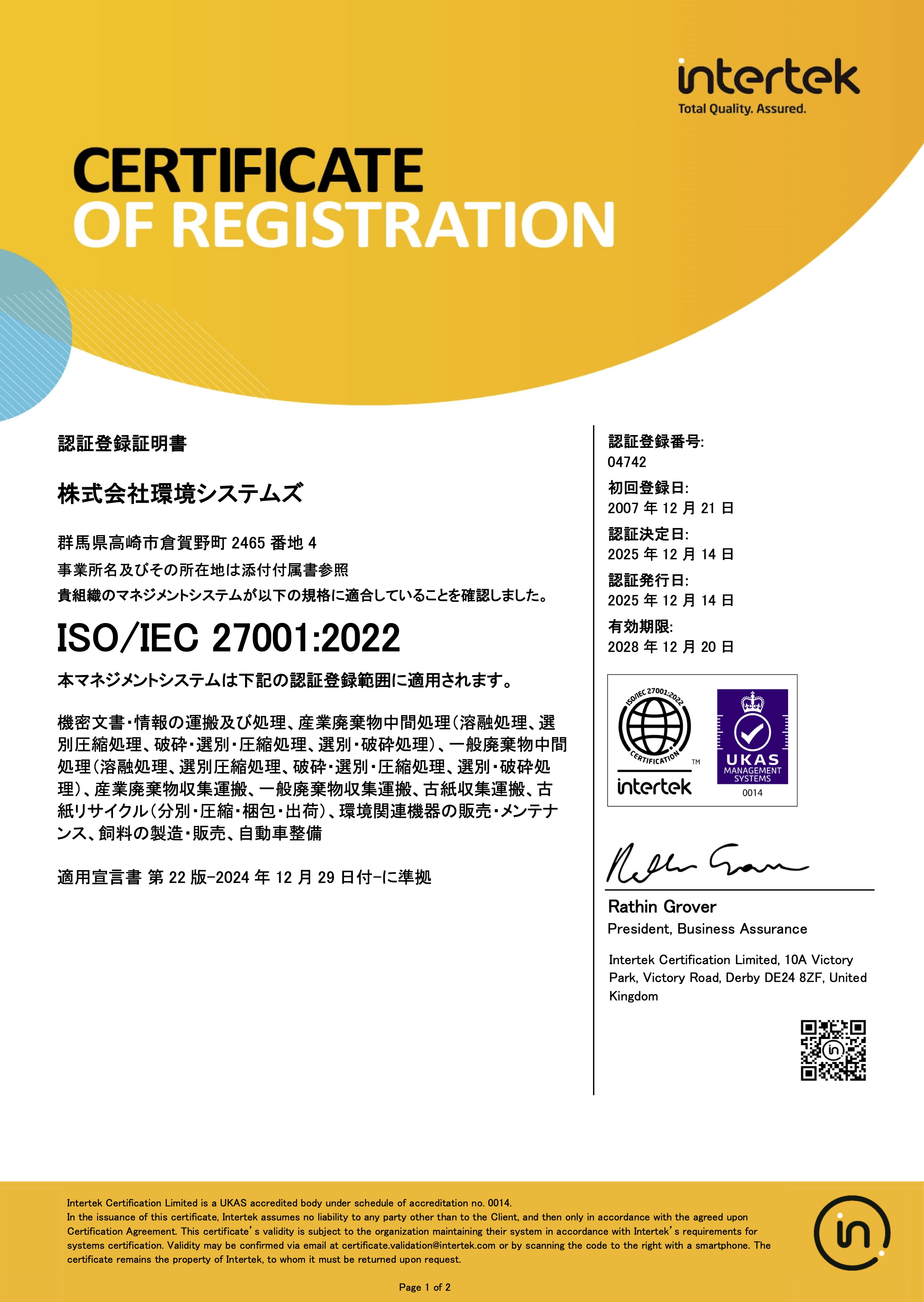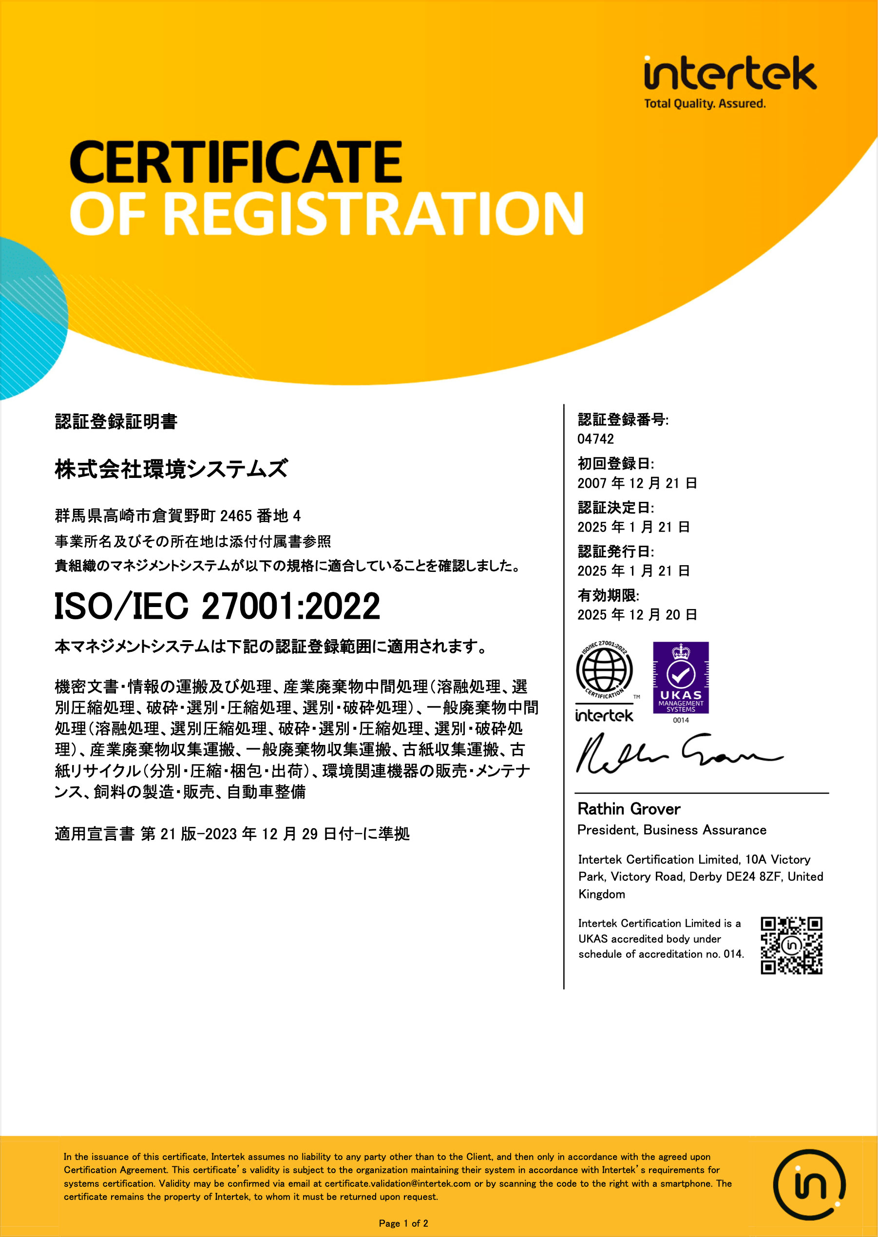 ■環境システムズでは、平成19年12月21日に情報セキュリティーマネジメントシステムの国際規格であるISO27001の認証を取得いたしました。