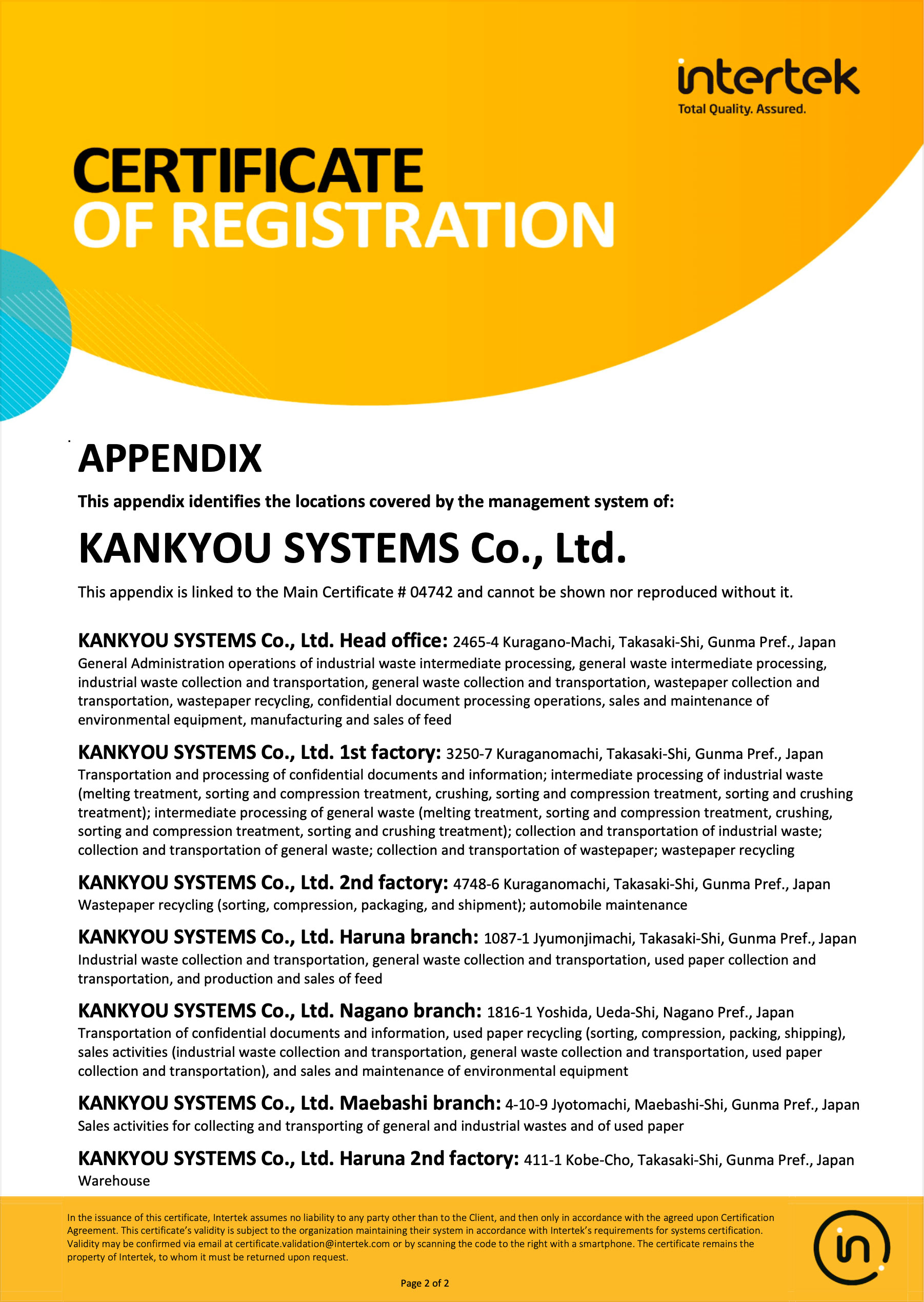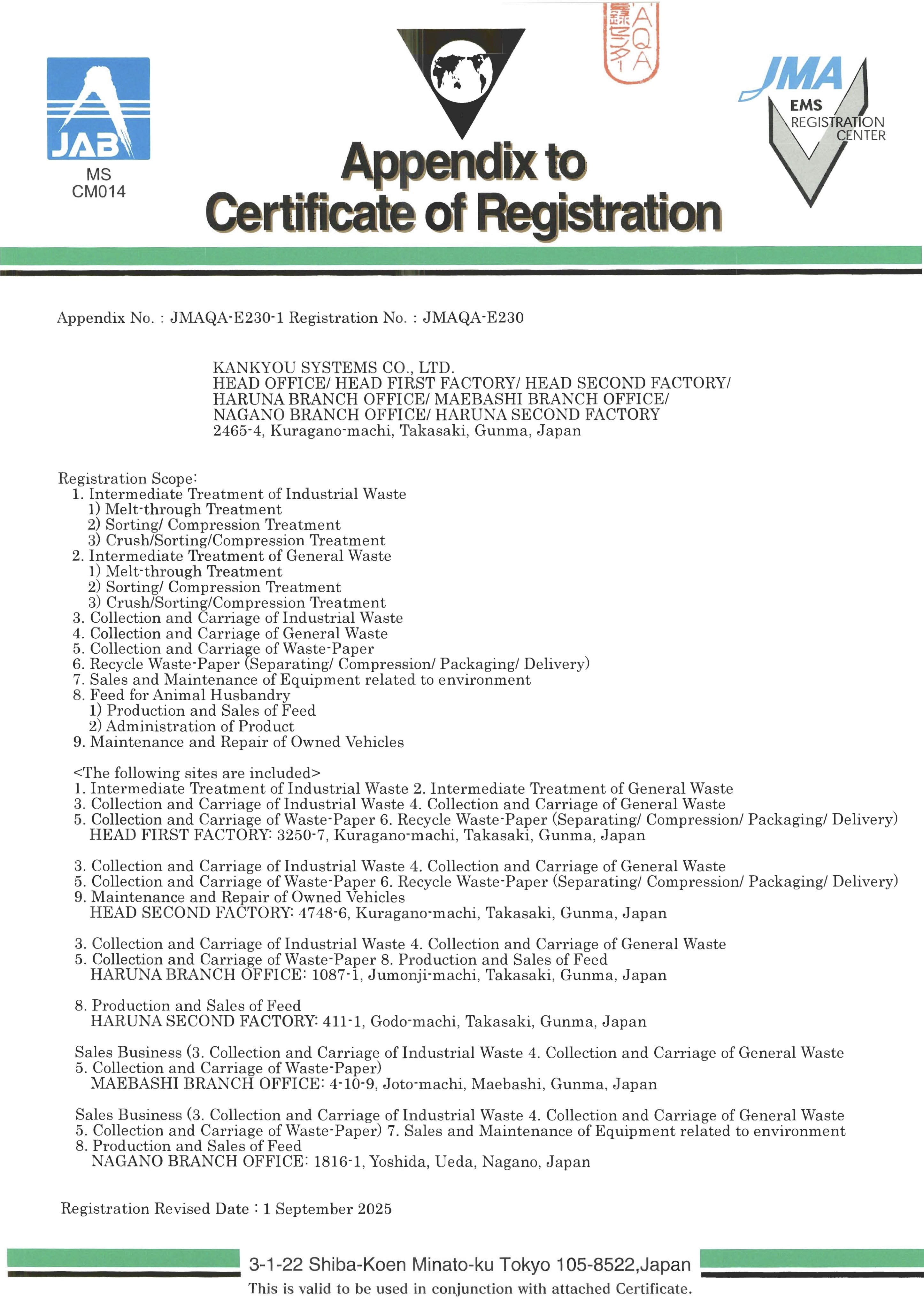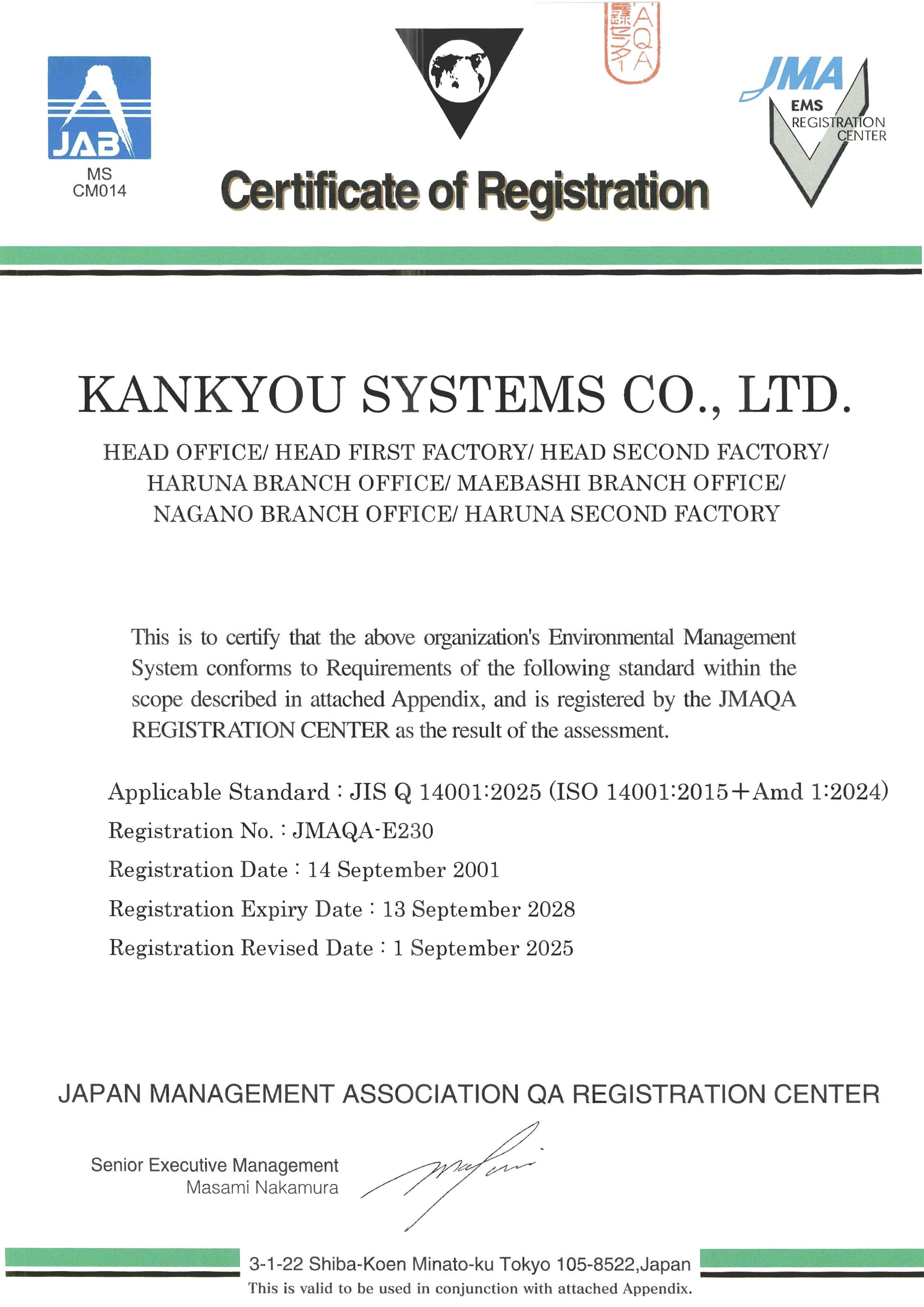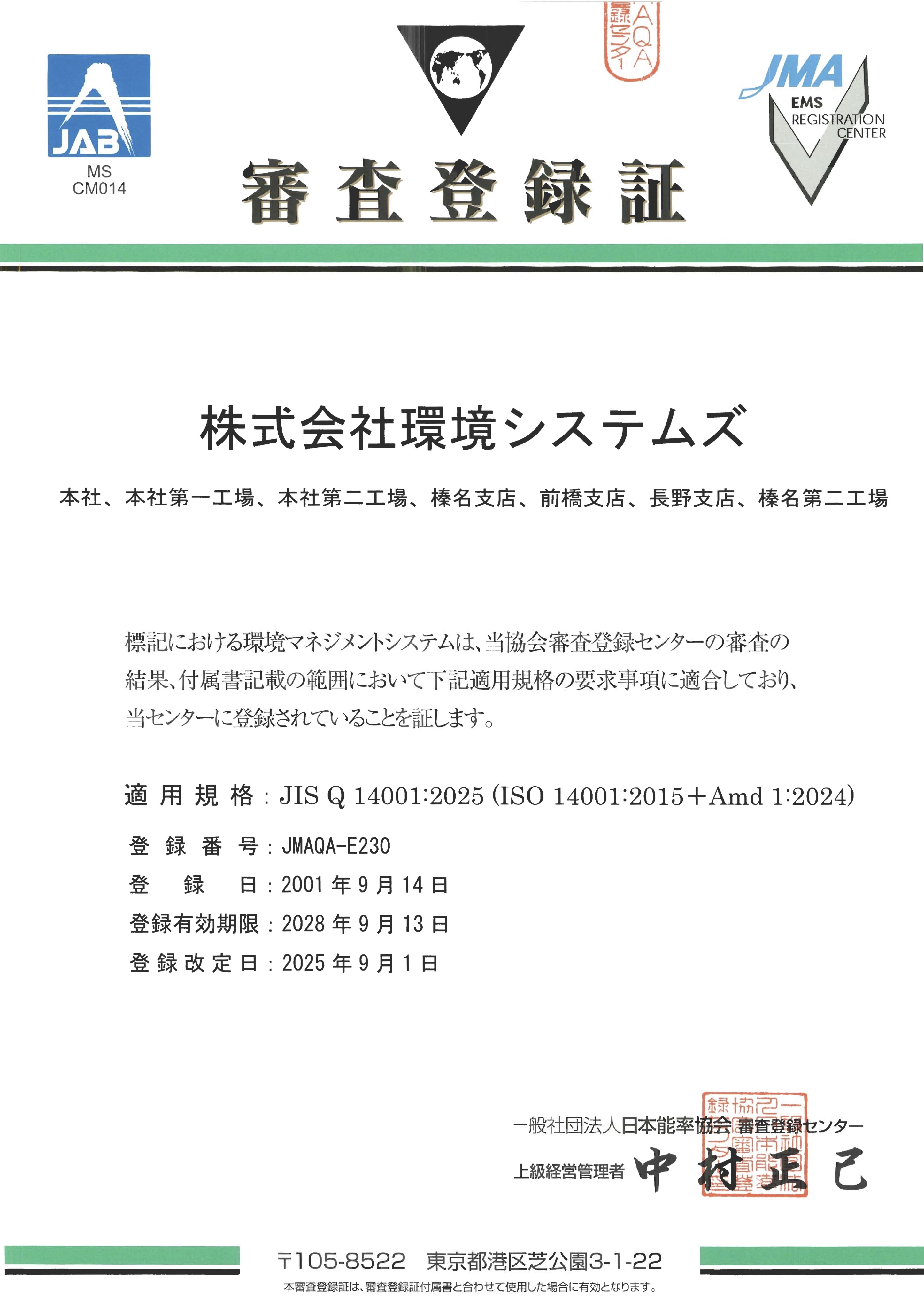 さらに、2004年版規格への改定にも対応し、今後もISO14001の活動を通して循環型社会の構築に貢献いたします。