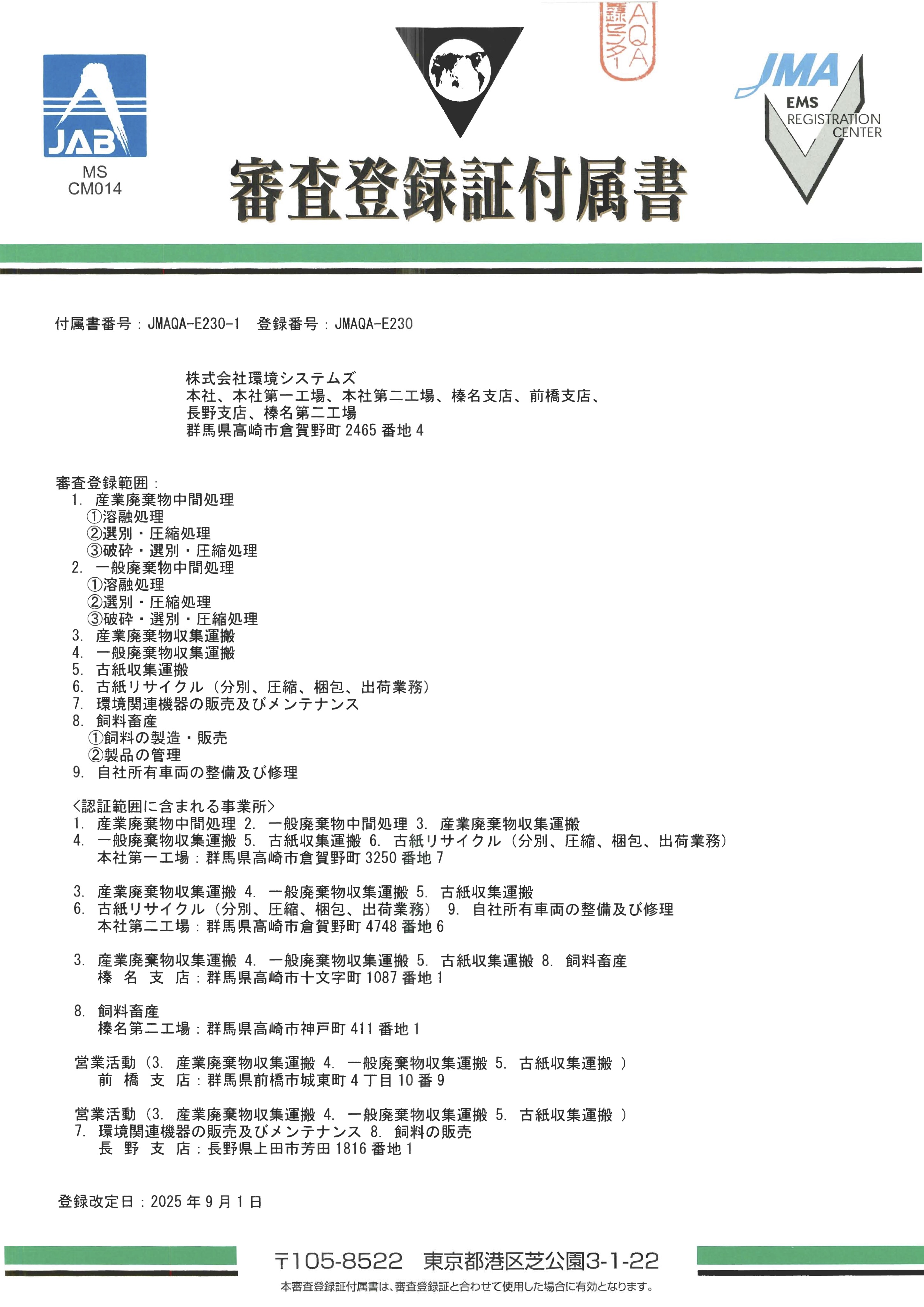 ■環境システムズでは国際標準化機構(ISO)が環境マネジメントシステムの構築・運用に必要な項目を規格化したISO14001を2001年9月に取得しました。